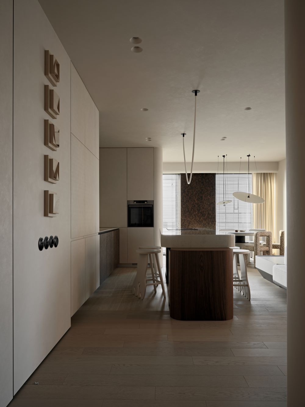 Основная задача — сохранить планировку, но полностью изменить ощущение пространства с помощью мягкой геометрии, продуманного света и правильных материалов.