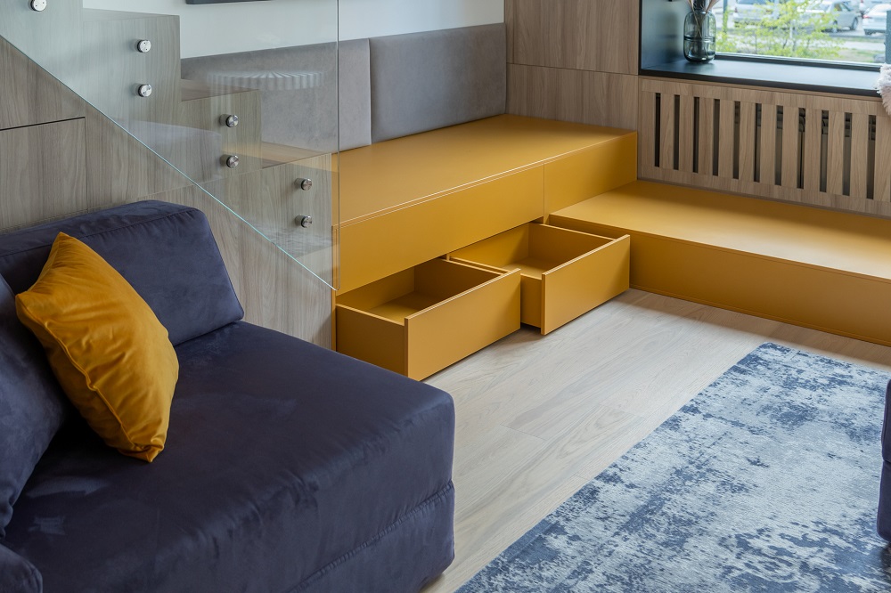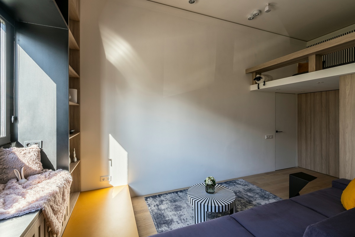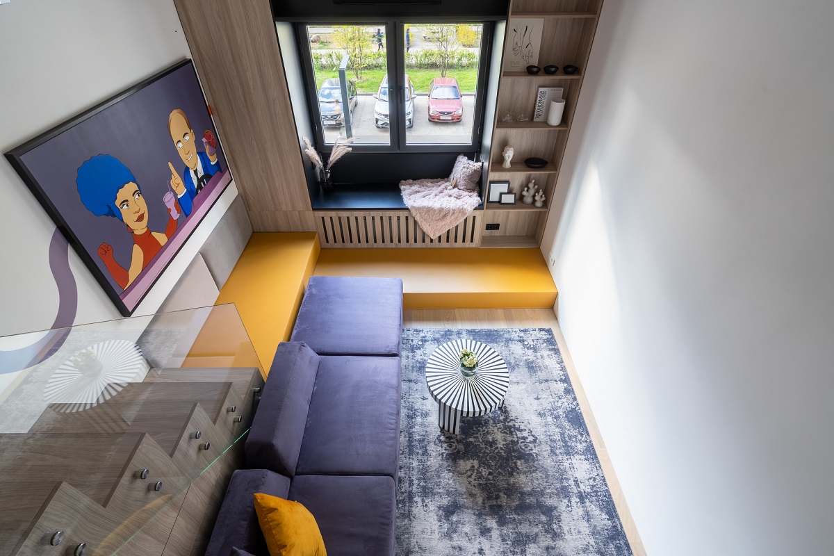 Дизайнеры использовали высоту потолка в 3,67 м и увеличили площадь гостиной почти в два раза! С появлением второго этажа открылись и новые возможности: дополнительное место для хранения, подиум у окна и лестница.
