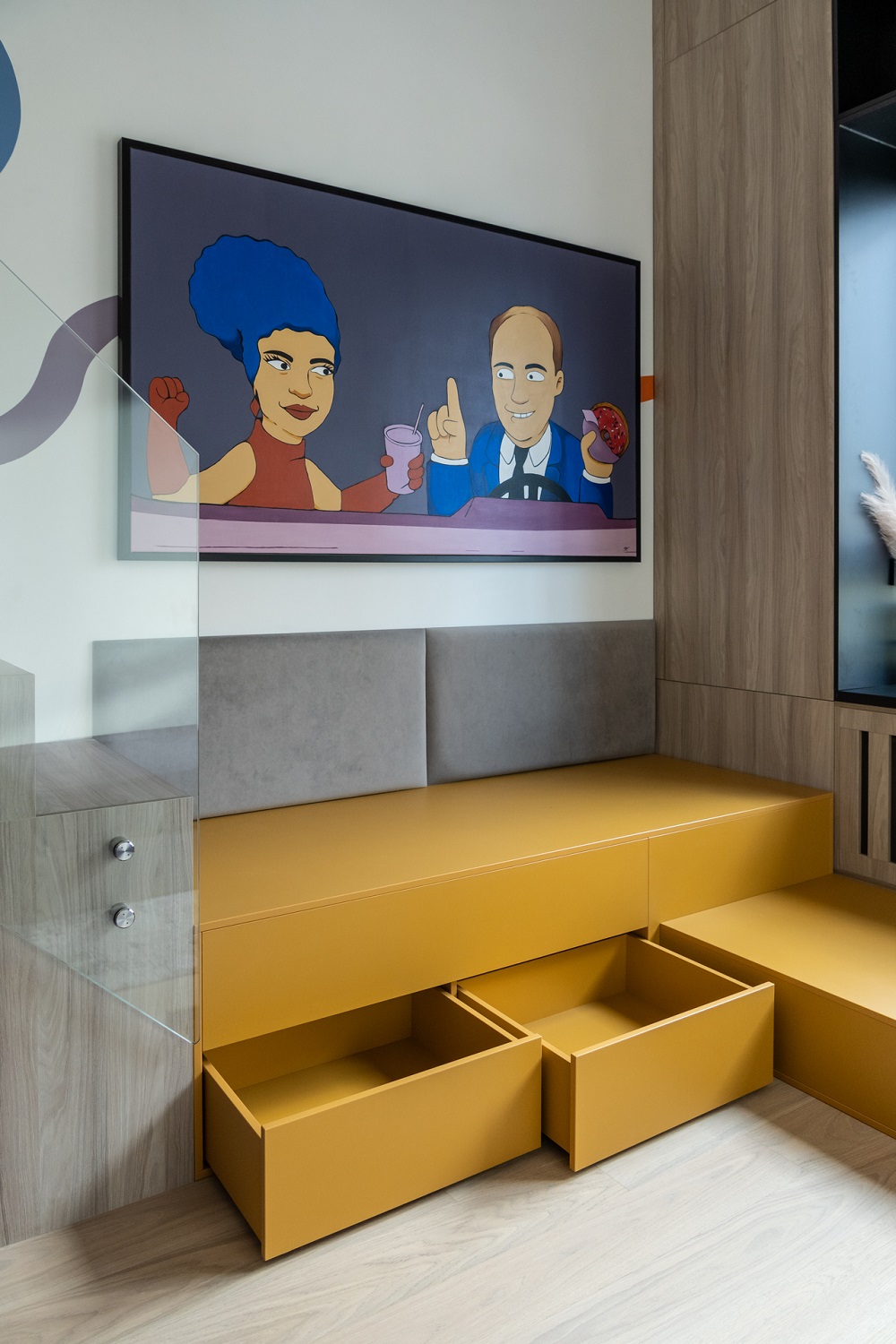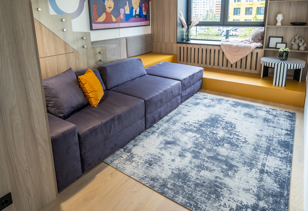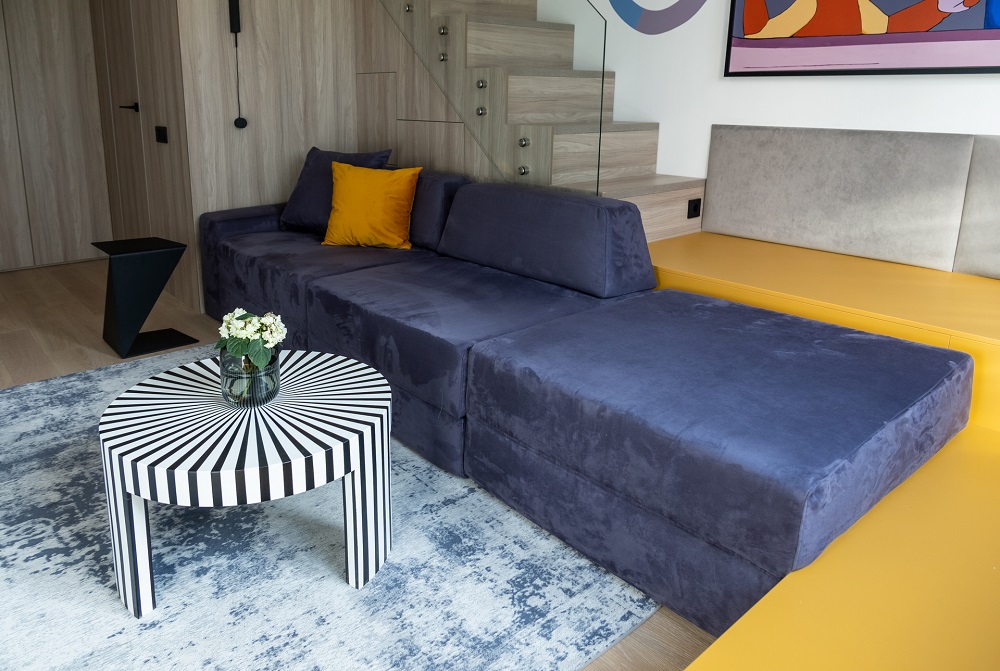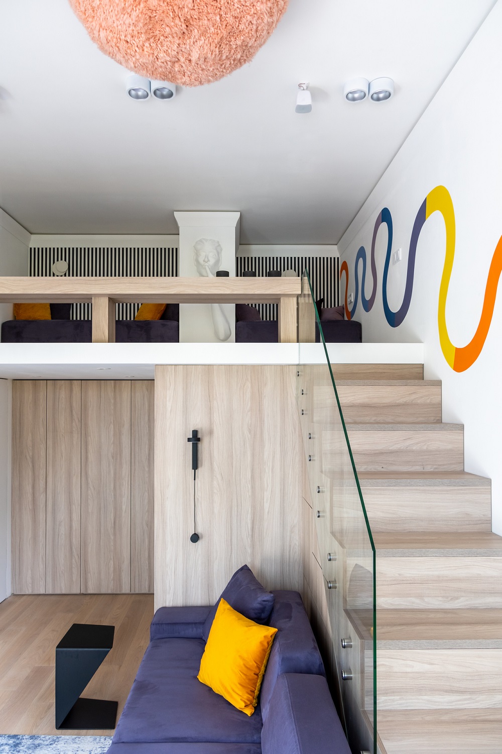 Дизайнеры использовали высоту потолка в 3,67 м и увеличили площадь гостиной почти в два раза! С появлением второго этажа открылись и новые возможности: дополнительное место для хранения, подиум у окна и лестница.